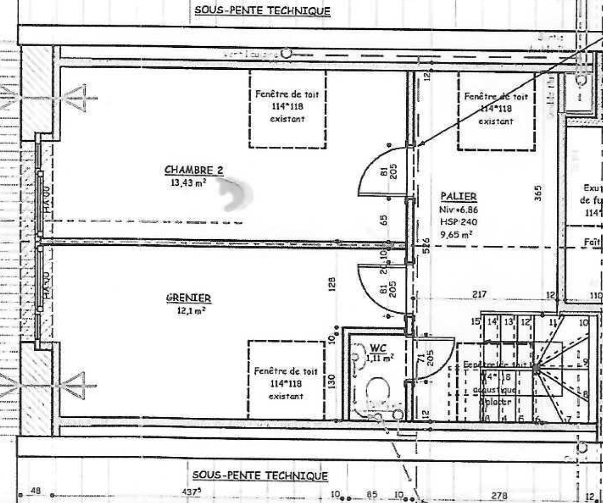 - À l'étage : palier et 2 chambres (13,43 m² et 12,10 m²)